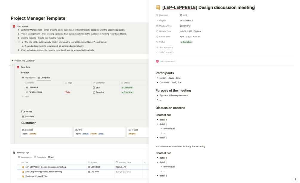 Record and document your meetings hassle-free. Our template auto-fills the meeting title in the format [Customer Name-Project Name], saving you time and providing clarity. Additionally, a standardized meeting template is generated automatically, allowing you to capture essential information efficiently.